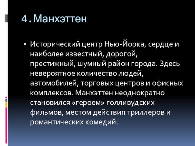 города. Здесь невероятное количество людей, автомобилей, торговых центров и офисных комплексов. Манхэттен неоднократно становился «героем» голливудских фильмов, местом действия триллеров и романтических комедий.