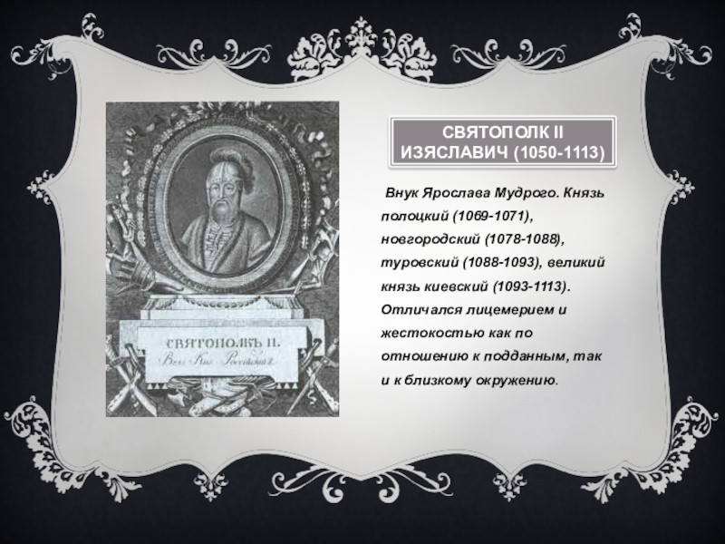 туровский (1088-1093), великий князь киевский (1093-1113). Отличался лицемерием и жестокостью как по отношению к подданным, так и к близкому окружению.