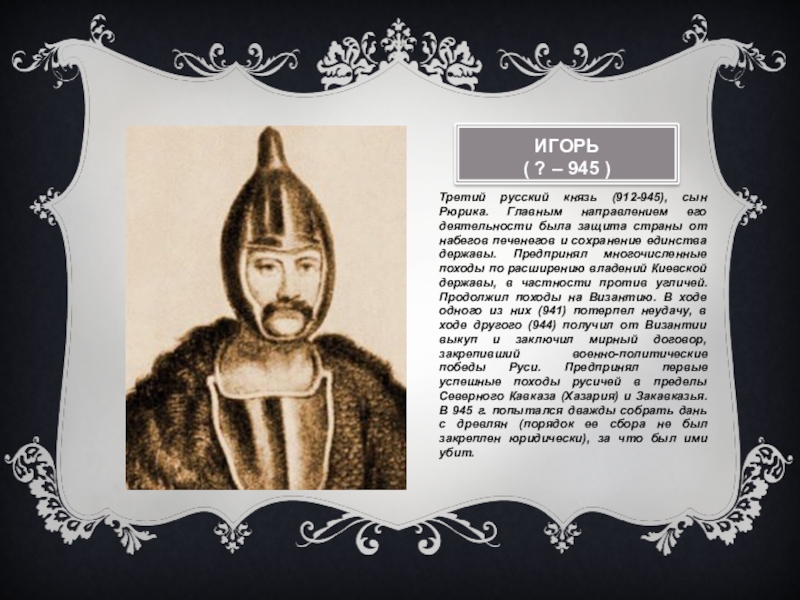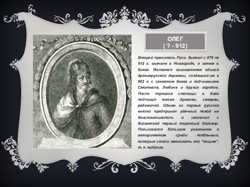 г. вначале в Новгороде, а затем в Киеве. Является основателем единой древнерусской державы, созданной им в 882 г. с захватом Киева и подчинением Смоленска, Любича и других городов. После переноса столицы в Киев подчинил также древлян, северян, радимичей. Одним из первых русских князей предпринял удачный поход на Константинополь и заключил с Византией первый торговый договор. Пользовался большим уважением и авторитетом среди подданных, которые стали именовать его "вещим", т. е. мудрым.