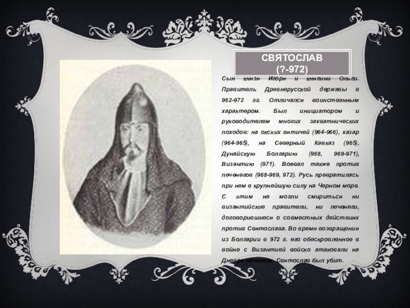 Сын князя Игоря и княгини Ольги. Правитель Древнерусской державы в