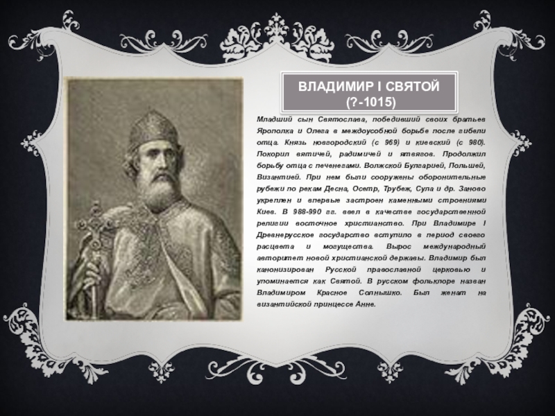 Олега в междоусобной борьбе после гибели отца. Князь новгородский (с 969) и киевский (с 980). Покорил вятичей, радимичей и ятвягов. Продолжил борьбу отца с печенегами. Волжской Булгарией, Польшей, Византией. При нем были сооружены оборонительные рубежи по рекам Десна, Осетр, Трубеж, Сула и др. Заново укреплен и впервые застроен каменными строениями Киев. В 988-990 гг. ввел в качестве государственной религии восточное христианство. При Владимире I Древнерусское государство вступило в период своего расцвета и могущества. Вырос международный авторитет новой христианской державы. Владимир был канонизирован Русской православной церковью и упоминается как Святой. В русском фольклоре назван Владимиром Красное Солнышко. Был женат на византийской принцессе Анне.