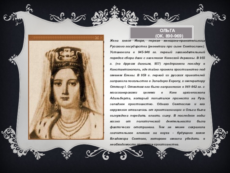Жена князя Игоря, первая женщина-правительница Русского государства (регентша при сыне Святославе). Установила в 945-946 гг. первый законодательный порядок сбора дани с населения Киевской державы. В 955 г. (по другим данным, 957) предприняла поездку в Константинополь, где тайно приняла христианство под именем Елены. В 959 г. первой из русских правителей направила посольство в Западную Европу, к императору Оттону I. Ответом его было направление в 961-962 гг. с миссионерскими целями в Киев архиепископа Адальберта, который попытался принести на Русь западное христианство. Однако Святослав и его окружение отказались от христианизации и Ольга была вынуждена передать власть сыну. В последние годы жизни от политической деятельности была фактически отстранена. Тем не менее сохранила значительное влияние на внука - будущего князя Владимира Святого, которого смогла убедить в необходимости принятия христианства.