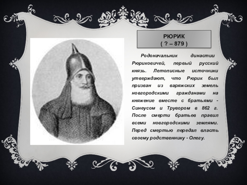 Слайд 2 Родоначальник династии Рюриковичей, первый русский князь. Летописные источники утверждают, что