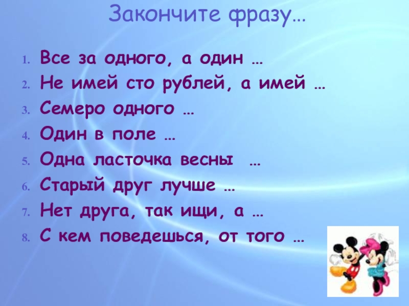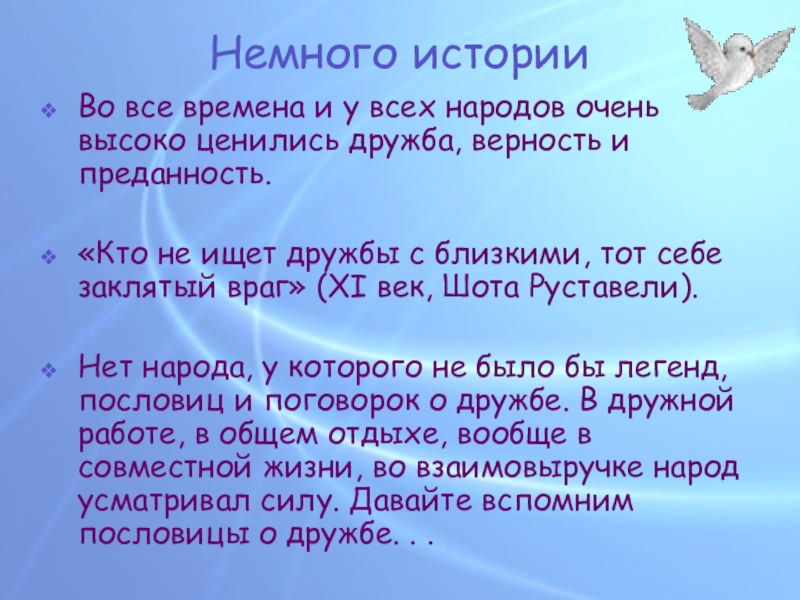 Нет народа, у которого не было бы легенд, пословиц и поговорок о дружбе. В дружной работе, в общем отдыхе, вообще в совместной жизни, во взаимовыручке народ усматривал силу. Давайте вспомним пословицы о дружбе. . .