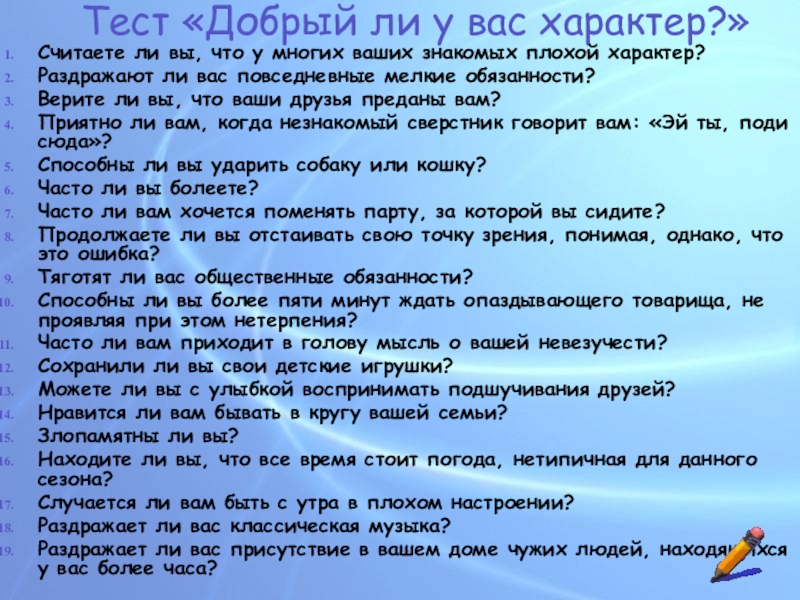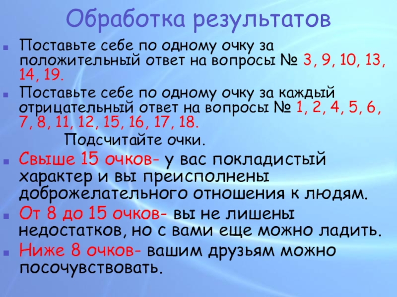 Свыше 15 очков- у вас покладистый характер и вы преисполнены доброжелательного отношения к людям.
