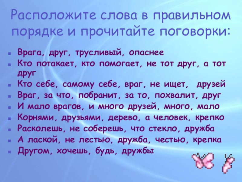 Слайд 4Расположите слова в правильном порядке и прочитайте поговорки: