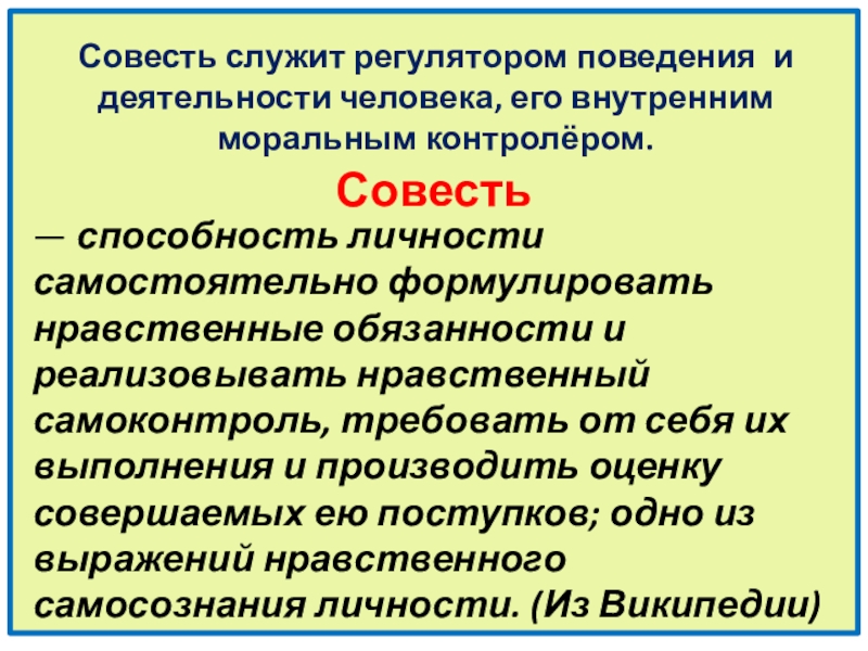 Совесть служит регулятором поведения и деятельности человека, его внутренним моральным контролёром.
