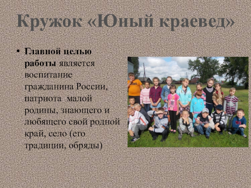 Главной целью работы является воспитание гражданина России, патриота малой родины, знающего и любящего свой родной край, село (его традиции, обряды)Кружок «Юный краевед»