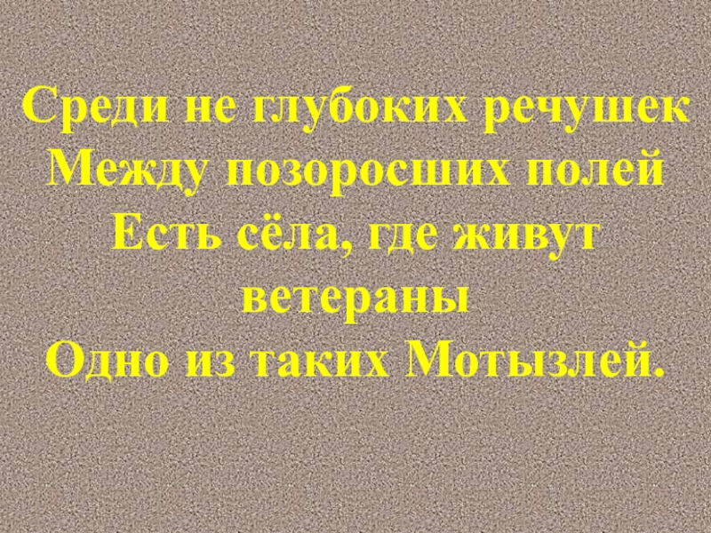 Среди не глубоких речушекМежду позоросших полейЕсть сёла, где живут ветераныОдно из таких Мотызлей.