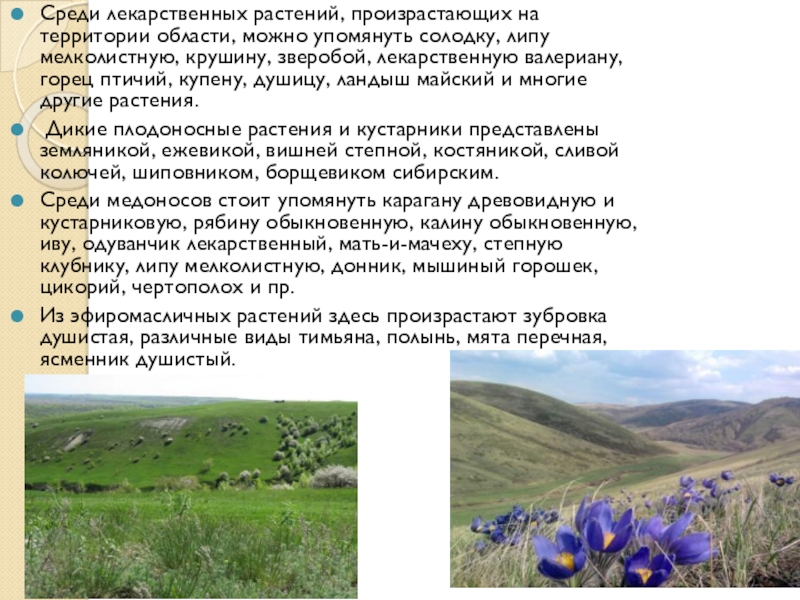 Слайд 8Среди лекарственных растений, произрастающих на территории области, можно упомянуть солодку, липу