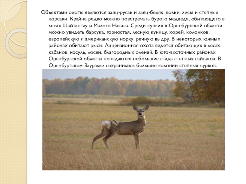 Слайд 11Объектами охоты являются заяц-русак и заяц-беляк, волки, лисы и степные корсаки.