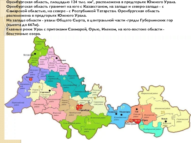Оренбургская область граничит на юге с Казахстаном, на западе и северо-западе - с Самарской областью, на севере - с Республикой Татарстан. Оренбургская область расположена в предгорьях Южного Урала.