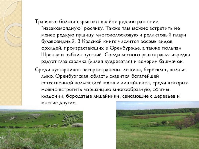 Слайд 9Травяные болота скрывают крайне редкое растение "насекомоядную" росянку. Также там можно