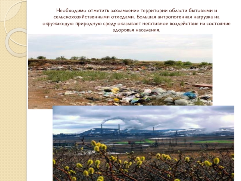 Слайд 6Необходимо отметить захламление территории области бытовыми и сельскохозяйственными отходами. Большая антропогенная