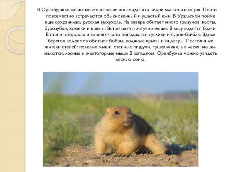 Слайд 10В Оренбуржье насчитывается свыше восьмидесяти видов млекопитающих. Почти повсеместно встречаются обыкновенный