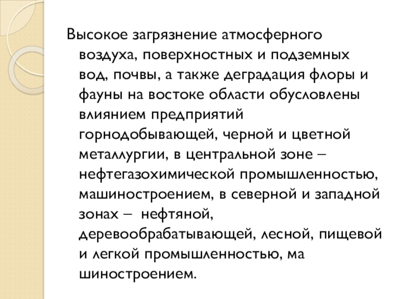 деградация флоры и фауны на востоке области обусловлены влиянием предприятий горнодобывающей, черной и цветной металлургии, в центральной зоне – нефтегазохимической промышленностью, машиностроением, в северной и западной зонах – нефтяной, деревообрабатывающей, лесной, пищевой и легкой промышленностью, машиностроением.