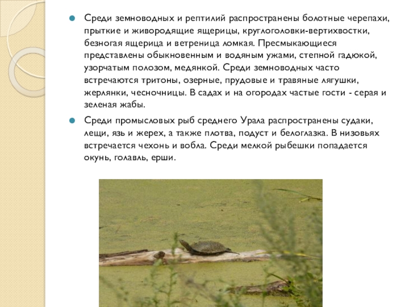 Слайд 13Среди земноводных и рептилий распространены болотные черепахи, прыткие и живородящие ящерицы,