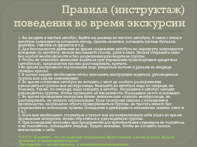 Правила (инструктаж) поведения во время экскурсии1. Вы входите в чистый автобус. Выйти вы должны из чистого автобуса.