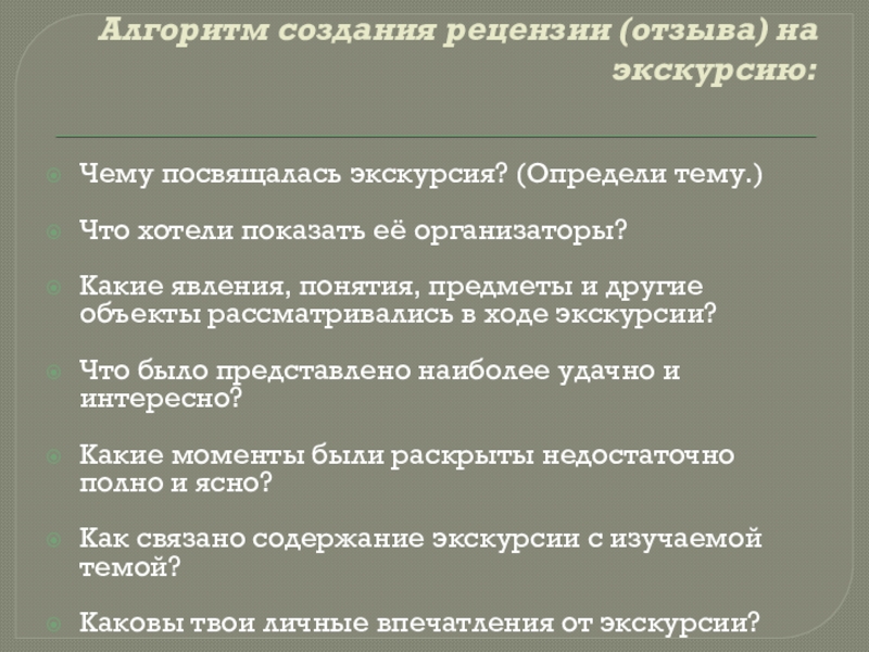 Алгоритм создания рецензии (отзыва) на экскурсию: Чему посвящалась экскурсия? (Определи тему.)Что хотели показать её организаторы?Какие явления, понятия,