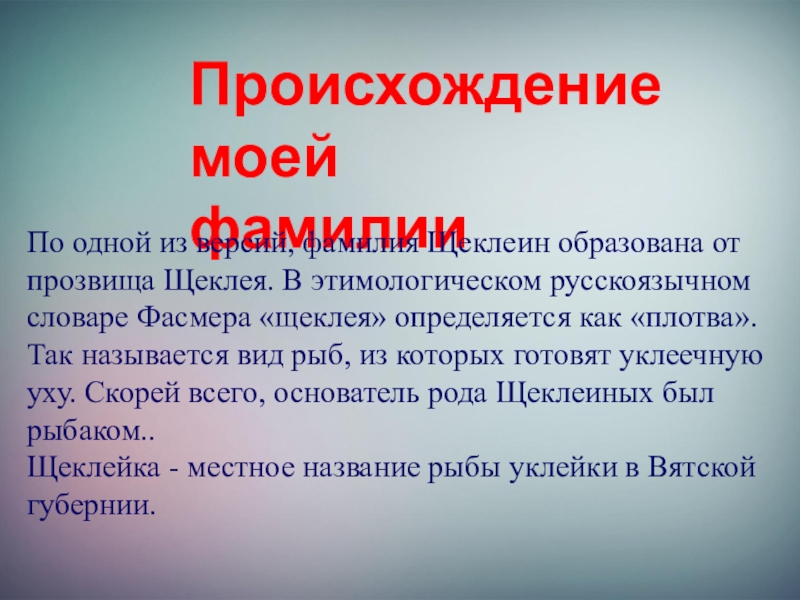 По одной из версий, фамилия Щеклеин образована от прозвища Щеклея. В этимологическом русскоязычном словаре Фасмера «щеклея» определяется как «плотва». Так называется вид рыб, из которых готовят уклеечную уху. Скорей всего, основатель рода Щеклеиных был рыбаком..