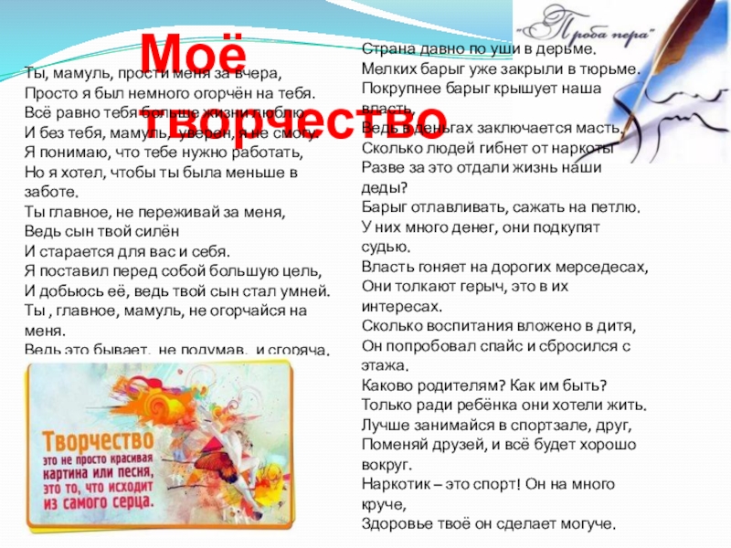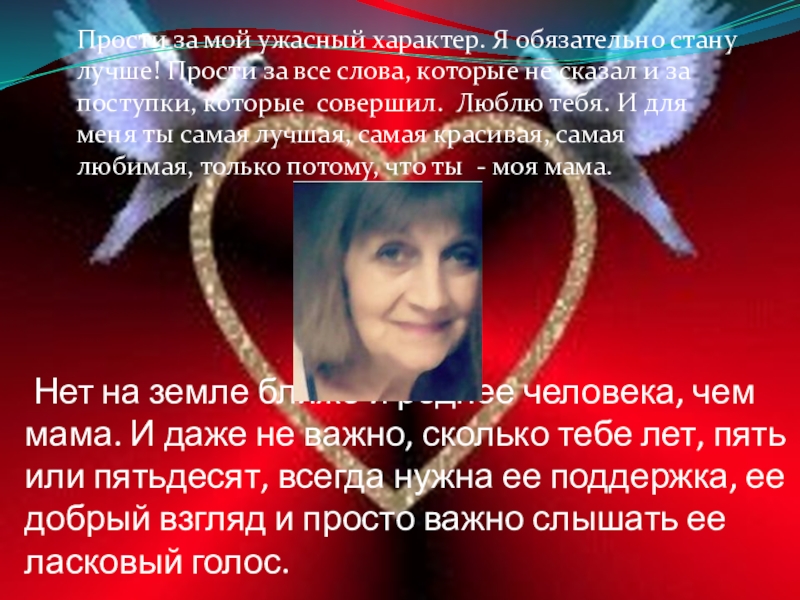 Прости за мой ужасный характер. Я обязательно стану лучше! Прости за все слова, которые не сказал и за поступки, которые совершил. Люблю тебя. И для меня ты самая лучшая, самая красивая, самая любимая, только потому, что ты - моя мама.