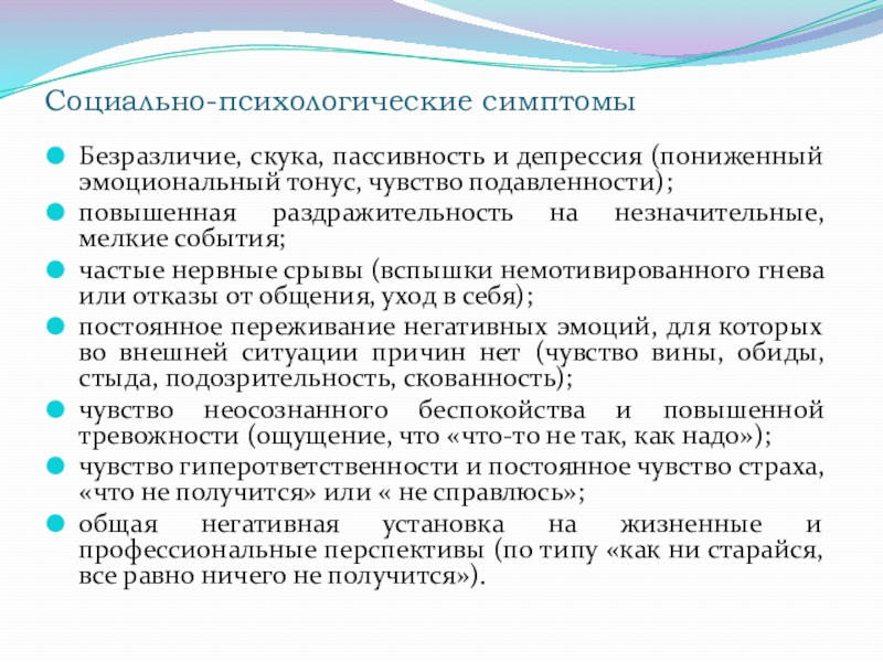 Безразличие, скука, пассивность и депрессия (пониженный эмоциональный тонус, чувство подавленности);