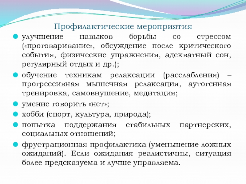 физические упражнения, адекватный сон, регулярный отдых и др.);