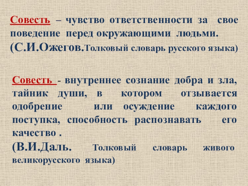Совесть - внутреннее сознание добра и зла, тайник души, в котором отзывается одобрение или осуждение каждого поступка, способность распознавать его качество .