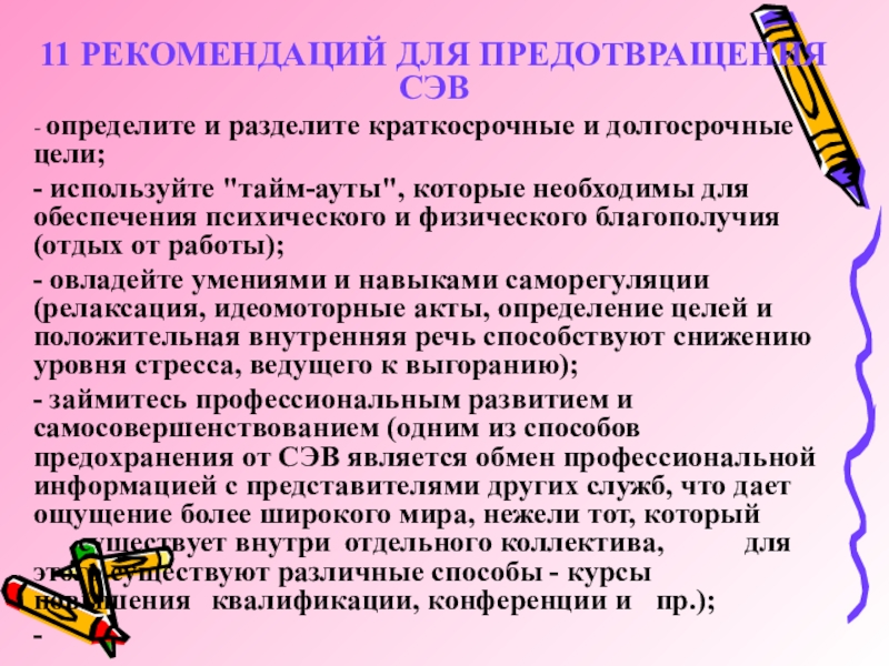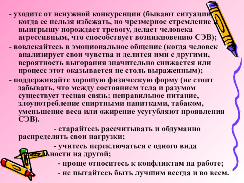 - овладейте умениями и навыками саморегуляции (релаксация, идеомоторные акты, определение целей и положительная внутренняя речь способствуют снижению уровня стресса, ведущего к выгоранию);