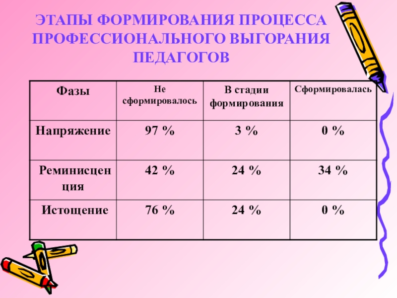 Слайд 7ЭТАПЫ ФОРМИРОВАНИЯ ПРОЦЕССА ПРОФЕССИОНАЛЬНОГО ВЫГОРАНИЯ ПЕДАГОГОВ