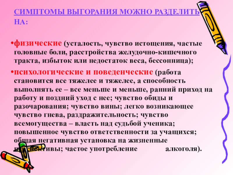 психологические и поведенческие (работа становится все тяжелее и тяжелее, а способность выполнять ее – все меньше и меньше, ранний приход на работу и поздний уход с нее; чувство обиды и разочарования; чувство вины; легко возникающее чувство гнева, раздражительность; чувство всемогущества – власть над судьбой ученика; повышенное чувство ответственности за учащихся; общая негативная установка на жизненные перспективы; частое употребление алкоголя).