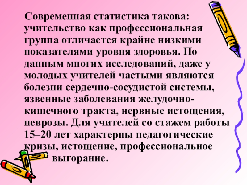 низкими показателями уровня здоровья. По данным многих исследований, даже у молодых учителей частыми являются болезни сердечно-сосудистой системы, язвенные заболевания желудочно-кишечного тракта, нервные истощения, неврозы. Для учителей со стажем работы 15–20 лет характерны педагогические кризы, истощение, профессиональное выгорание.