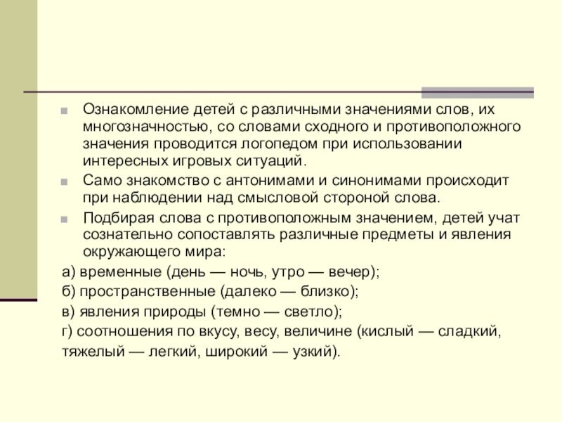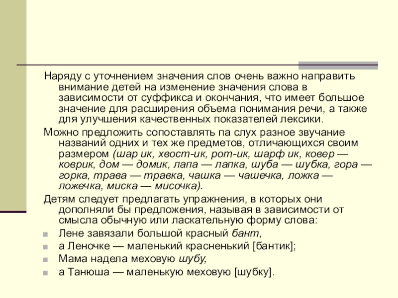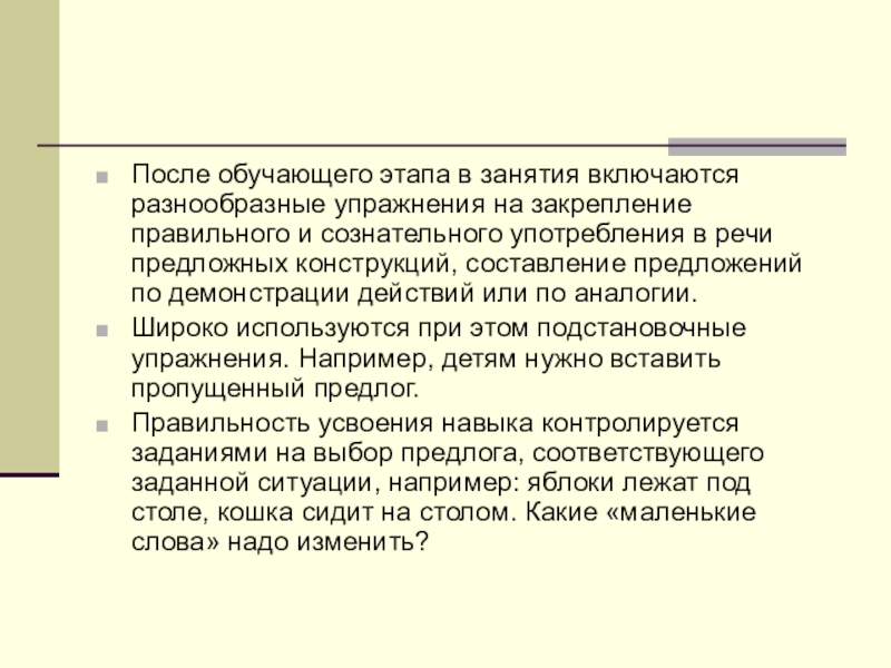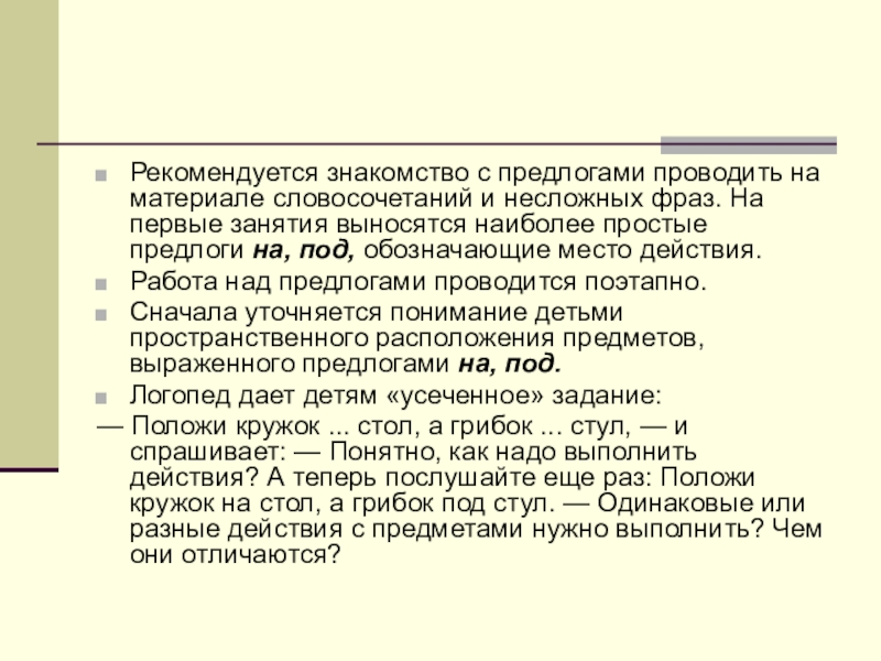 Очень важно при этом неоднократно повторять однотипные упражнения в различных наглядных ситуациях так, чтобы ребенок мог достаточно точно понять не только значение слов, но и условия их употребления.