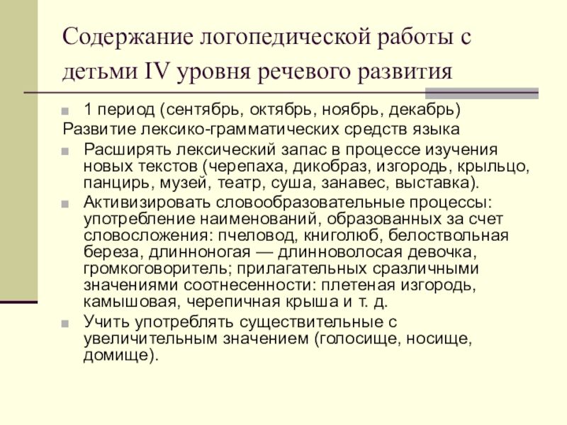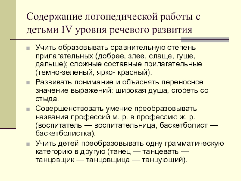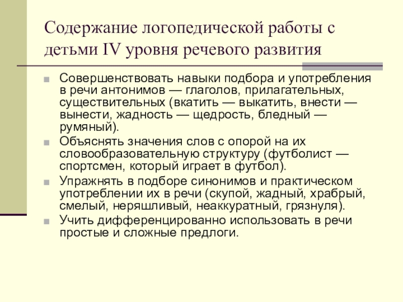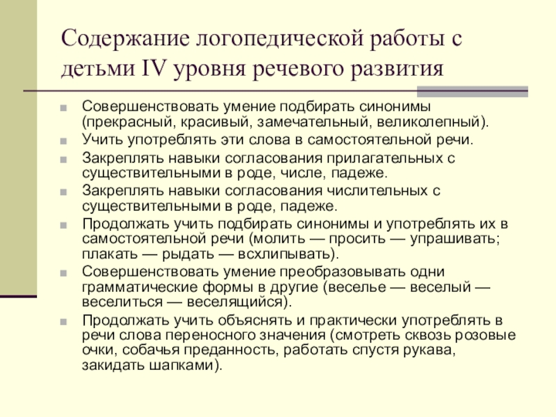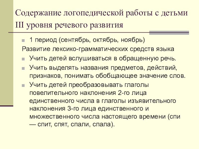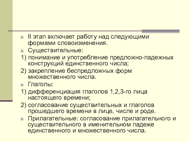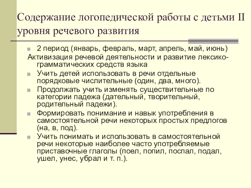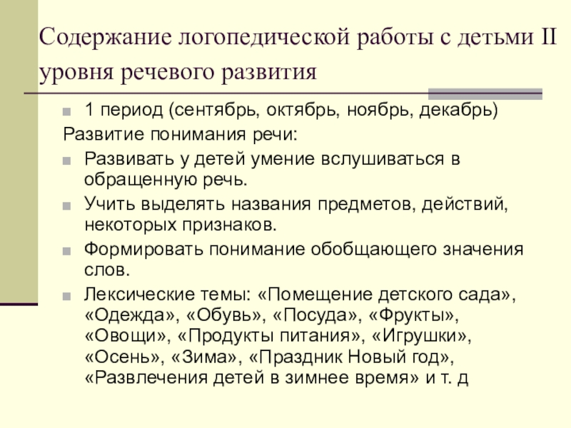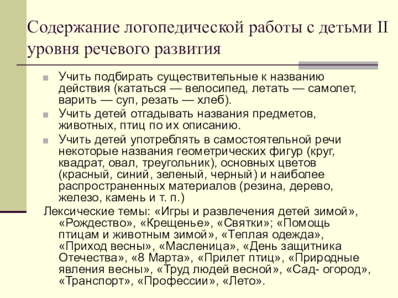 Слайд 9Содержание логопедической работы с детьми II уровня речевого развития