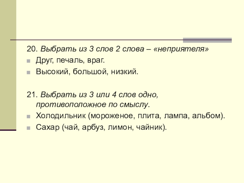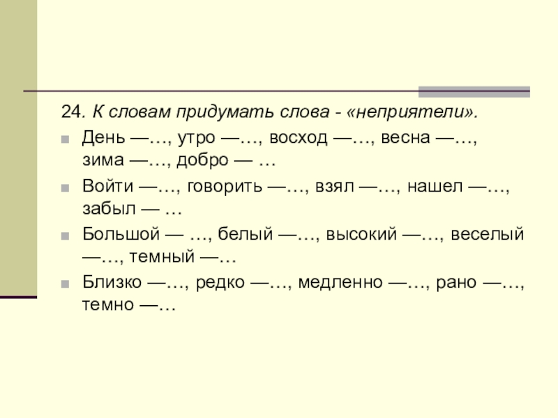 действия и признаки, противоположные по значению (надень пальто — сними, налей — вылей, завяжи бант — развяжи, повесь полку — сними, открой дверь — закрой;