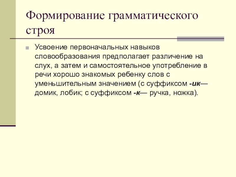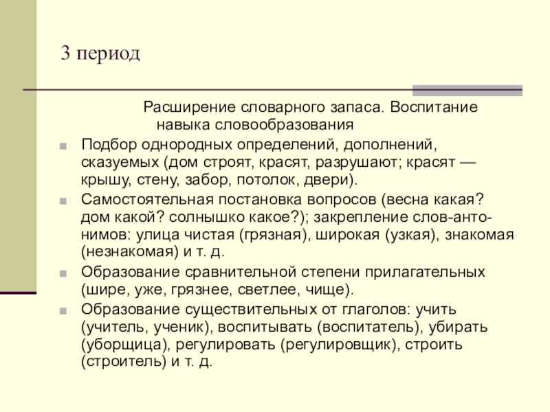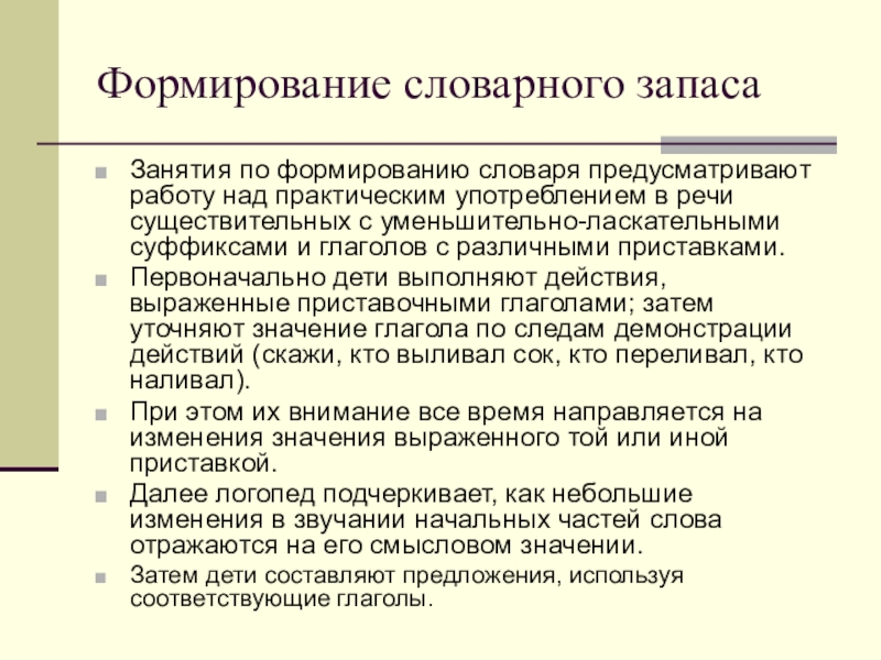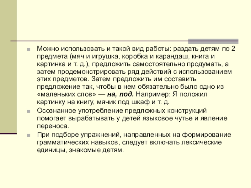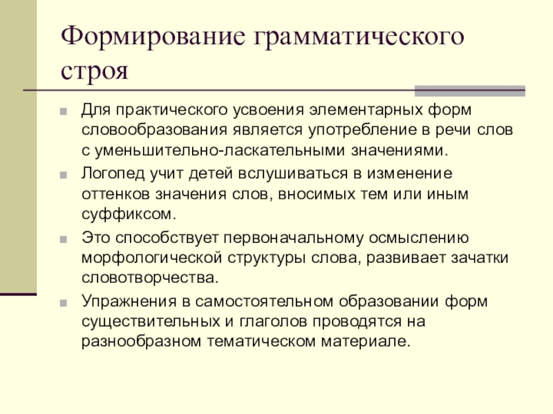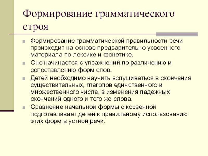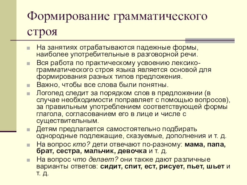 Работа по практическому усвоению лексики является основой формирования грамматического строя языка. Практическое усвоение грамматических конструкций является основой формирования разных типов предложений, владение которыми создают основу для развития связной речи