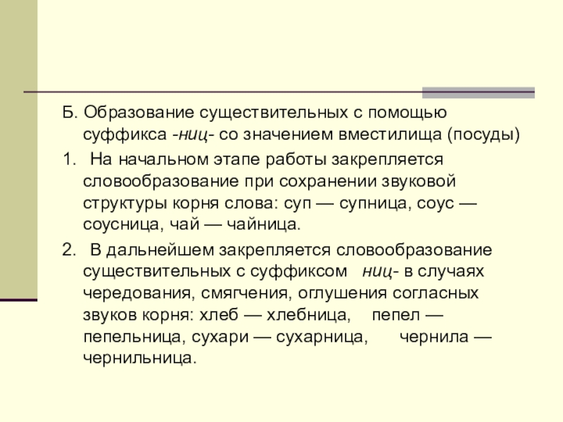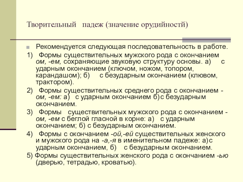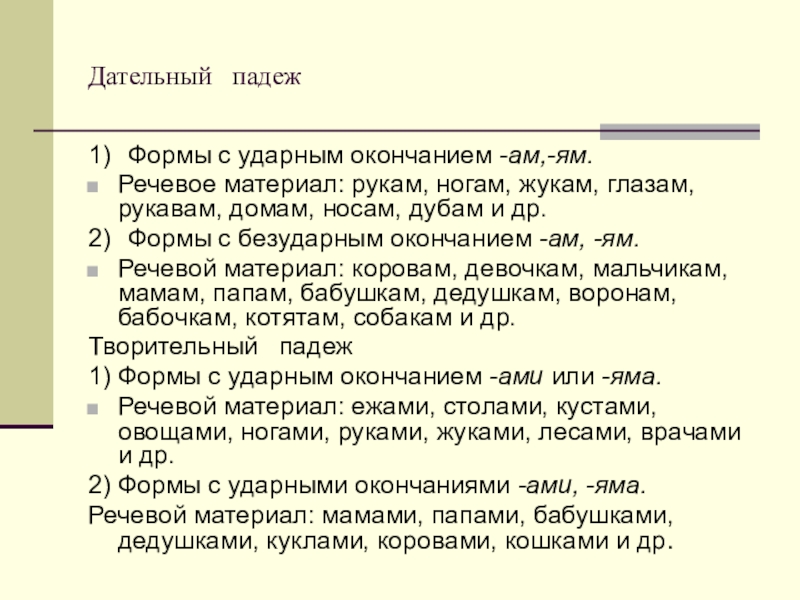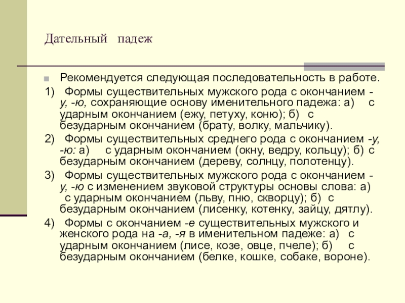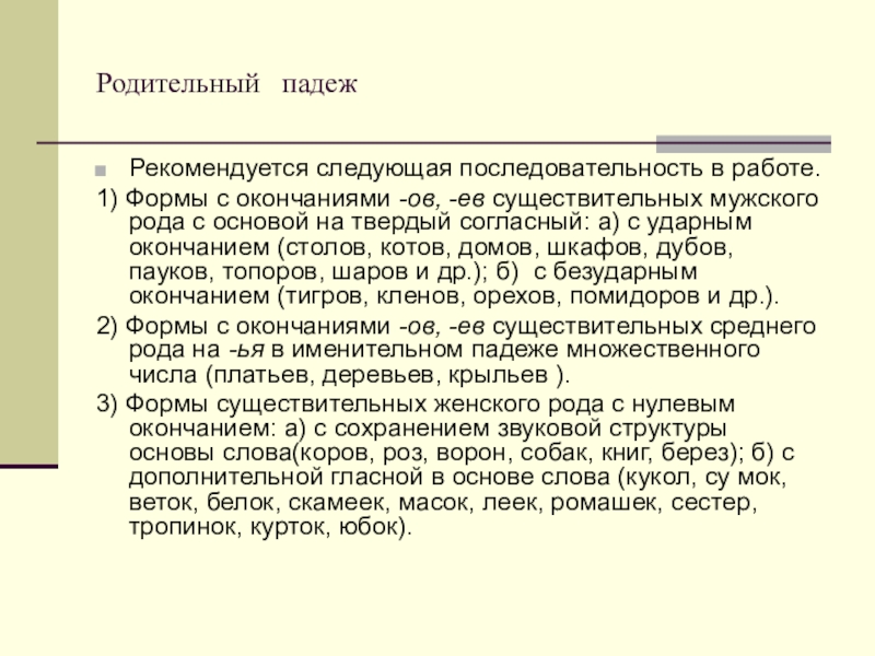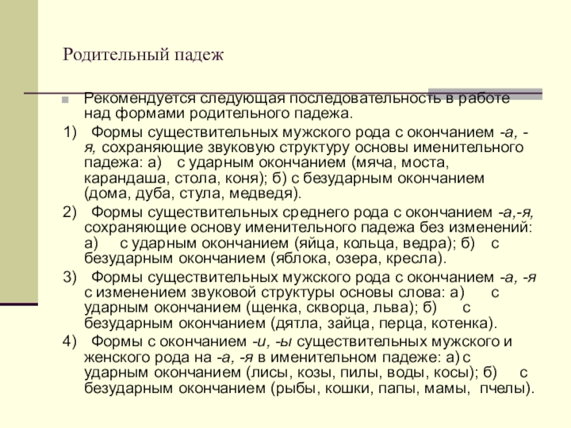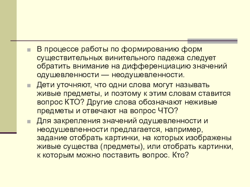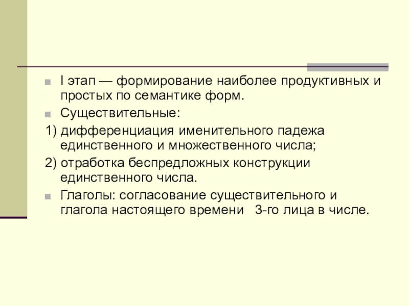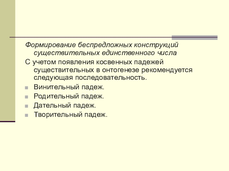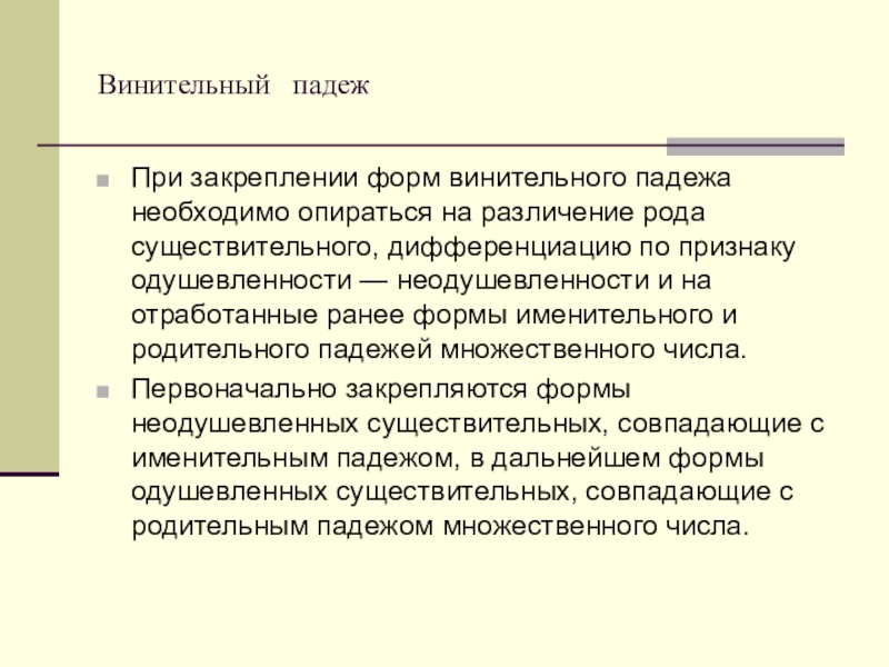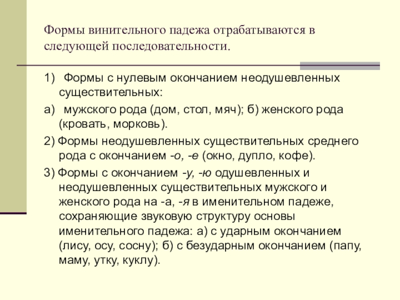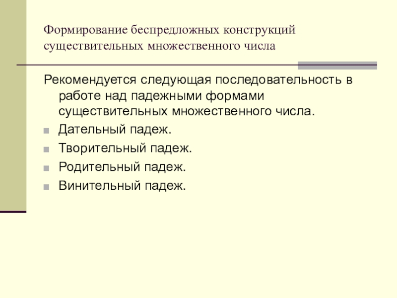 Первоначально закрепляются формы неодушевленных существительных, совпадающие с именительным падежом, в дальнейшем формы одушевленных существительных, совпадающие с родительным падежом множественного числа.