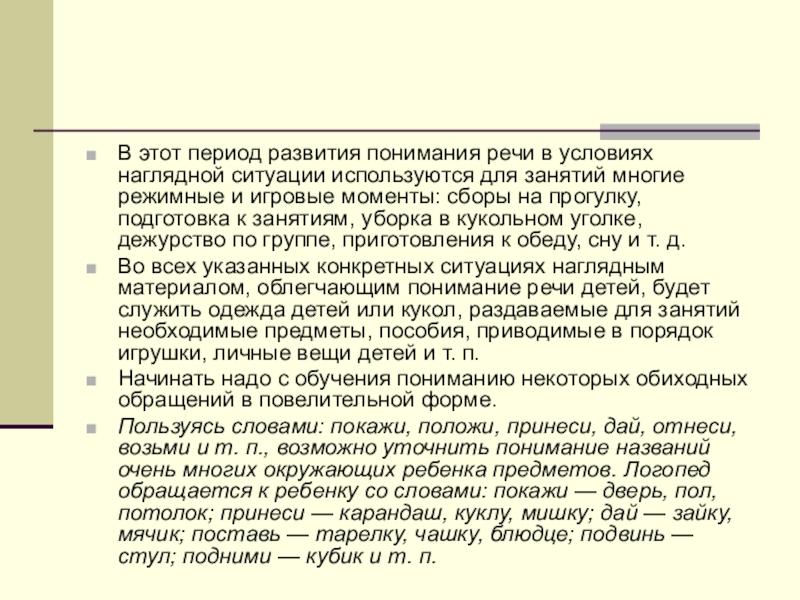 В этот период развития понимания речи в условиях наглядной ситуации используются