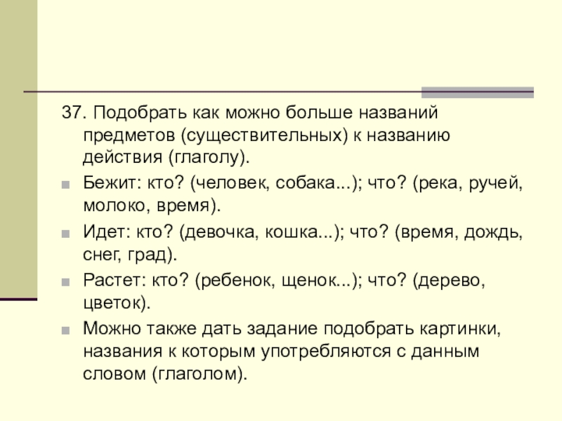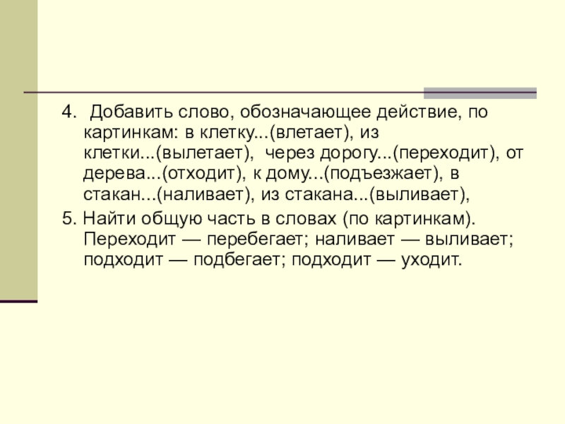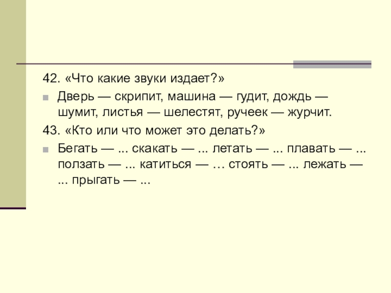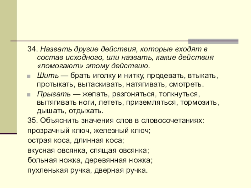 шьет, спит — лежит, несет — везет, прыгает — бежит, шьет — вышивает и т. д.);