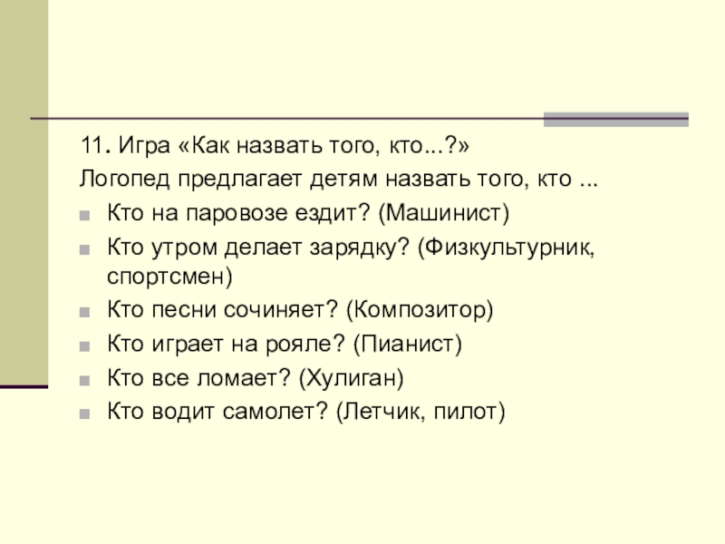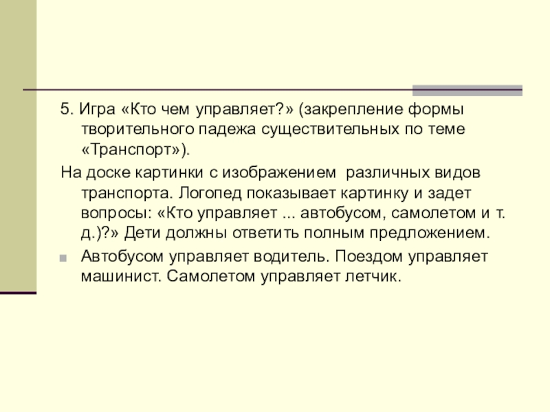 На доске картинки с изображением различных видов транспорта. Логопед показывает картинку и задет вопросы: «Кто управляет ... автобусом, самолетом и т. д.)?» Дети должны ответить полным предложением.
