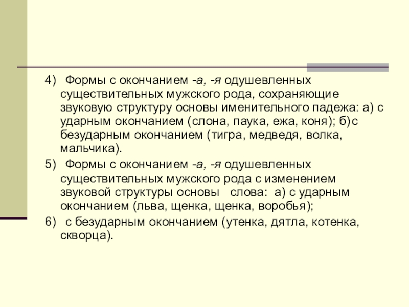 5) Формы с окончанием -ей существительных мужского рода с основой на мягкий согласный или шипящий звук: а) с ударным окончанием (врачей, шалашей, лосей, гусей, ежей, кирпичей, ножей, пней, камней и др.); б) безударным окончанием (портфелей, медведей).