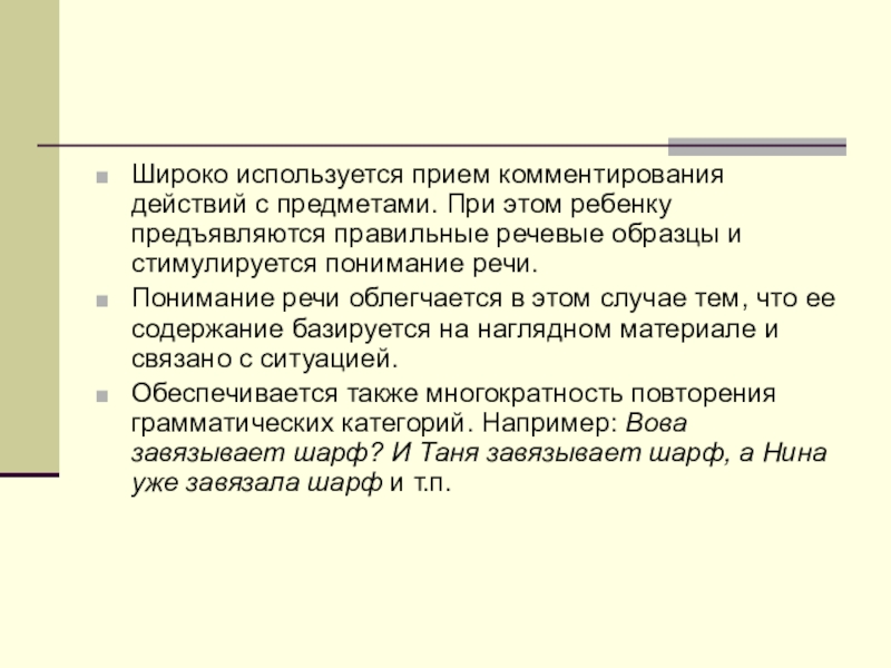 Широко используется прием комментирования действий с предметами. При этом ребенку предъявляются