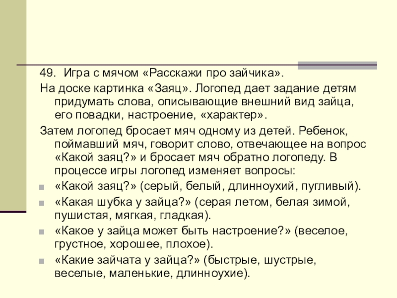 Логопед называет часть предложения и бросает мяч одному из детей. Ребенок, поймавший мяч, должен закончить предложение, используя слова справа, слева, впереди, позади.