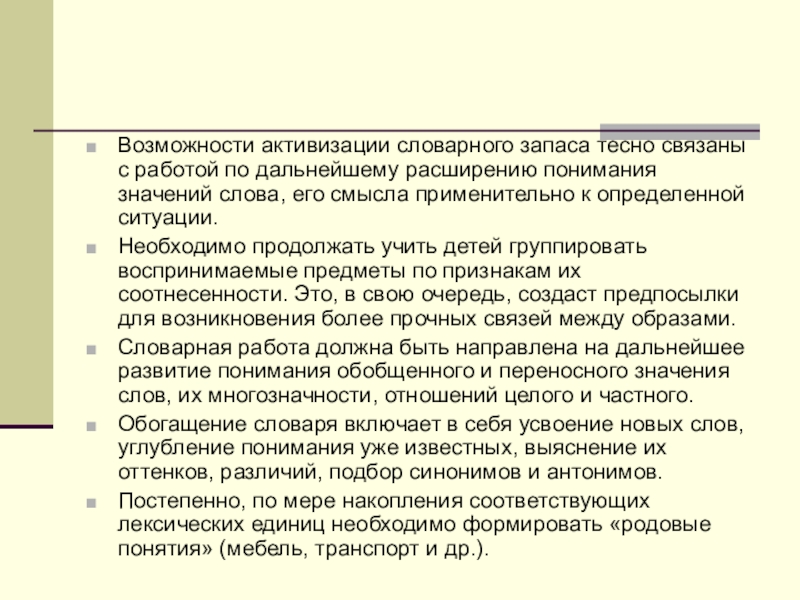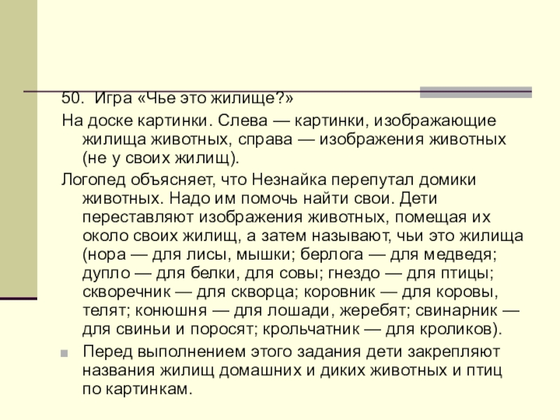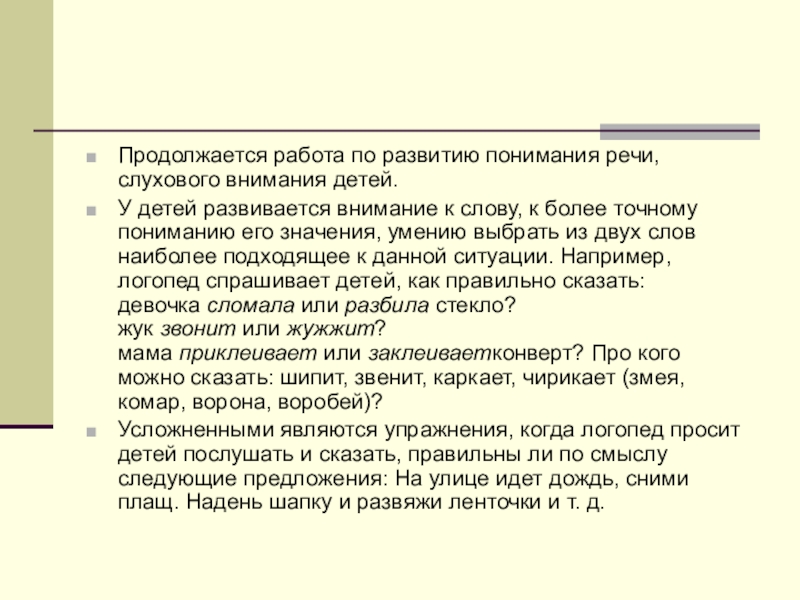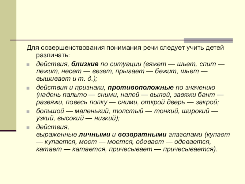 Понимание речи облегчается в этом случае тем, что ее содержание базируется на наглядном материале и связано с ситуацией.