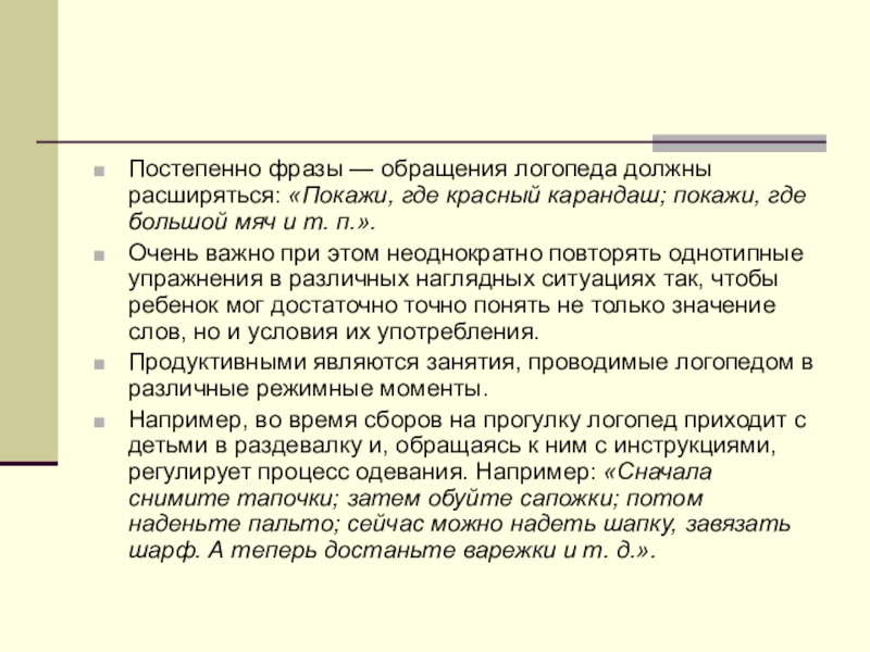 Постепенно фразы — обращения логопеда должны расширяться: «Покажи, где красный карандаш; покажи,