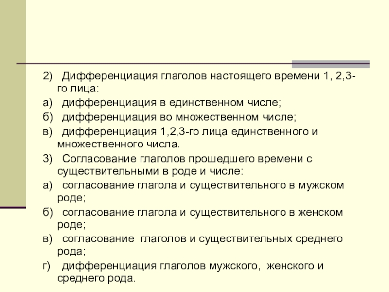 г) дифференциация глаголов мужского, женского и среднего рода.