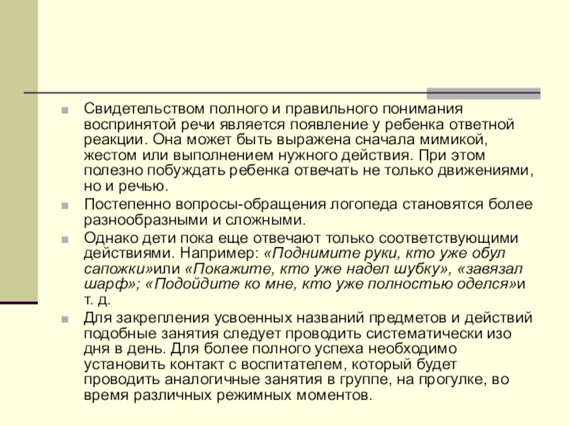 Свидетельством полного и правильного понимания воспринятой речи является появление у ребенка