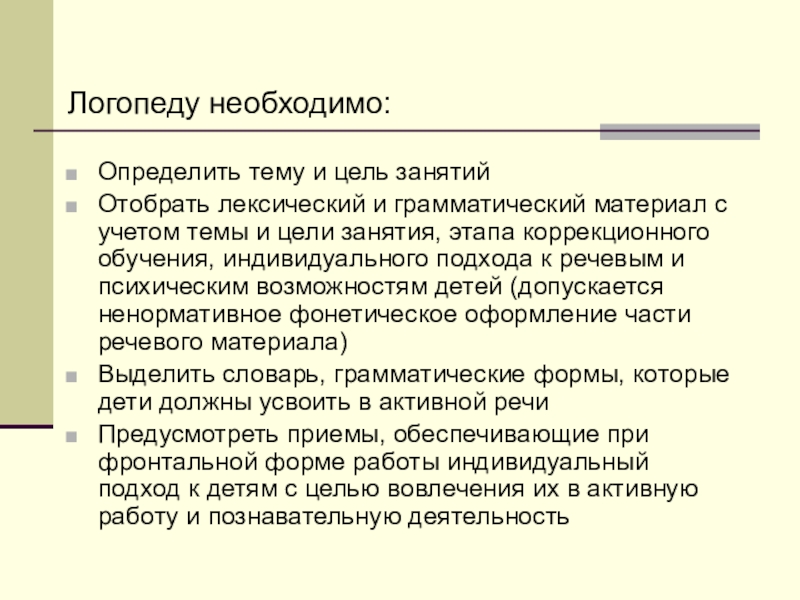 учетом темы и цели занятия, этапа коррекционного обучения, индивидуального подхода к речевым и психическим возможностям детей (допускается ненормативное фонетическое оформление части речевого материала)