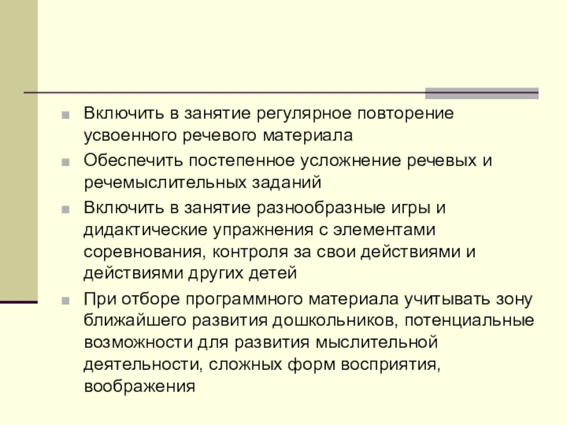 Включить в занятие регулярное повторение усвоенного речевого материала