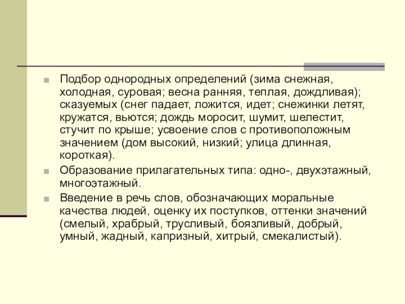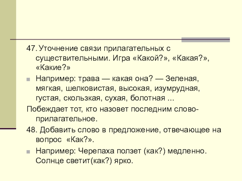 Закрепление согласования прилагательного с существительным проводится сначала в словосочетаниях, далее — в предложениях различной структуры, позднее — в связной речи.